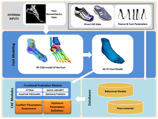 The determination and optimization of these parameters necessitates the development of (a) highly-accurate foot and shoe models, (b) appropriate finite-element models of the foot and shoe components, and (c) highly-accurate simulation tools based on human behavioral models. The project results will enable footwear manufacturers to produce high-quality casual or professional shoes complying with the necessary comfort standards. A unique characteristic of the proposed solution is that it will be available either for mass production or for manufacturing customized products.